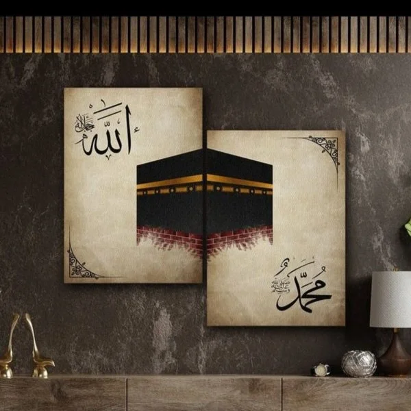 Enhance your space with this elegant Islamic Wall Décor Kaaba Art Frame, featuring abstract Allah and Muhammad (ﷺ) calligraphy—designed to bring a calm, spiritual, and refined presence to your interiors.