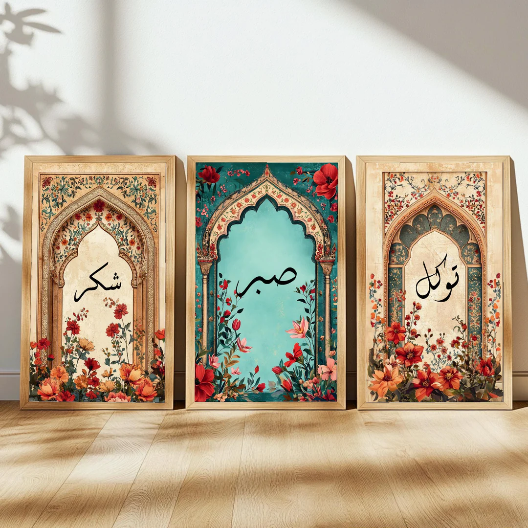Islamic Calligraphy Art Print Set of 3 – Sabr, Tawakkul, Shukr Wall Decor (8×11 inches)